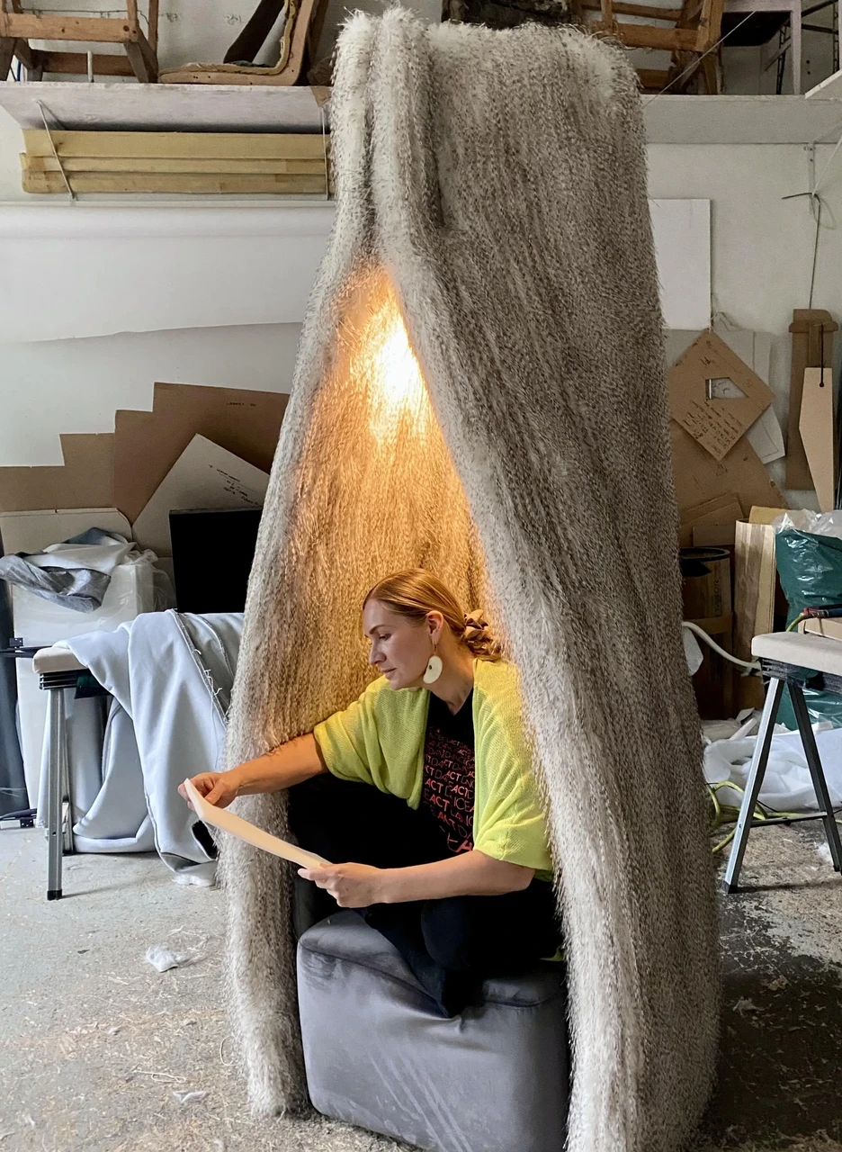 At the Tallinn Design Festival INTERIOR+ mini-fair, Loreida proudly presents the sculptural acoustic armchair SaLA, originally designed in 2018 for the Proact oƯice. For the fair, the chair has been dressed in a striking furry coat and complemented with reading light as well as a smaller sibling, SaLA M, without the acoustic shielding. The tall SaLA L chair has found its way into several public building projects, especially educational institutions, where the need for quiet, private spaces has been recognized. The easiest way to experience the chair yourself is to try it anytime in the lobby of Nordic Hotel Forum in the heart of Tallinn (ArtAku Interior Architecture Bureau, 2021).